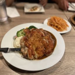 Ah gone are the days of my childhood with the old Garden Cafe of Rowland Heights, but I'm glad there's at least Garden Bistro. It's the same owner as the old Garden, so at least there's commonalities. The food is old school Hong Kong Asian and Western fusion food, dating back to when Hong Kong was a British colony. Most of us with immigrant parents from Hong Kong are accustomed to this kind of cuisine. This hit the spot. We came as a party of 5, which included my parents, my husband, and our 15 month old. Service was extremely friendly. Without asking, we were given a booth to accommodate the baby. We ordered baked Bolognese, 2 orders of the fried chicken steak with spaghetti, seafood curry, and oxtail stew. For an extra $3.50 my husband added a milk tea with his meal which comes with one free refill. Everything was delicious. We pretty much demolished everything. The Bolognese is as flavorful and guilty as I remember. The chicken was crispy on the outside and juicy on the inside. We love mixing the extra spaghetti with the Bolognese sauce. The chicken plate also came with zucchini, corn, and mashed potatoes. The curry was flavorful and the oxtail stew was amazing. Unlike the old days you don't get a complimentary bowl of soup with your orders anymore; you have to pay extra. While it's not exactly the Garden Cafe from my childhood, it is a close rendition with similar foods that my whole favorite enjoy. And now my baby and husband enjoy it too.